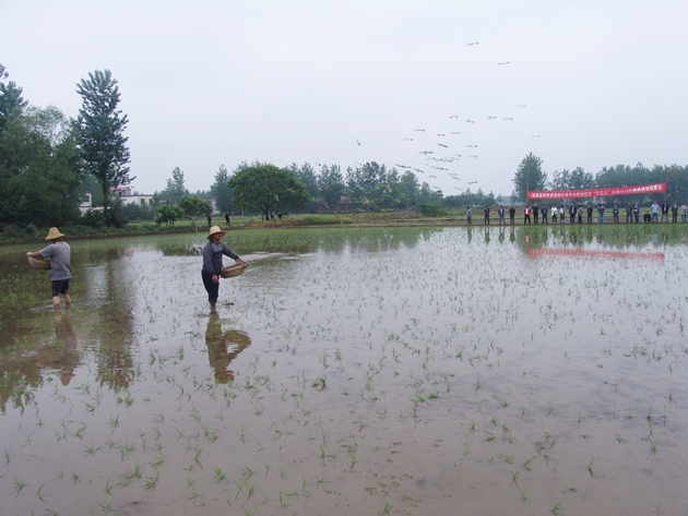 在王水村關(guān)自順的水田里,關(guān)自順和同村的曾廣兵兩人并排行走,一手斜挎裝滿(mǎn)秧苗的籃子,一手熟練地把秧苗拋在大田中,4畝大小的稻田,二人只用了不到一小時(shí)就拋栽完畢,拋栽質(zhì)量之好讓現場(chǎng)人員驚嘆不止。關(guān)自順自豪地告訴前來(lái)觀(guān)摩的人說(shuō),他們家今年種了近50畝水稻,全部采用“泥質(zhì)法”拋栽育秧技術(shù),按照今天這樣的速度,他們兩個(gè)人不到兩天就可全部拋栽完,人也不覺(jué)得累,就像在田里逛了一圈。以前采用人工插秧的時(shí)候,效率低不說(shuō),一天干下來(lái),腰疼的都直不起來(lái)。