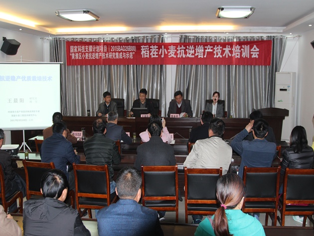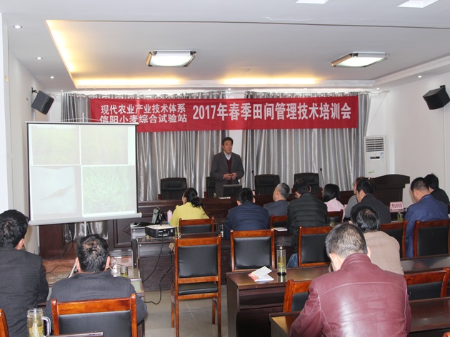 培訓會(huì )上,王晨陽(yáng)研究員作了《小麥抗逆穩產(chǎn)優(yōu)質(zhì)栽培技術(shù)》學(xué)術(shù)報告,從河南小麥主要氣象災害發(fā)生、災害防控技術(shù)、弱筋小麥栽培技術(shù)等方面講述了各種隱性災害的發(fā)生危害情況、防控機理及弱筋小麥關(guān)鍵栽培技術(shù);院小麥所陳金平研究員、李宇峰研究員、周?chē)诟毖芯繂T分別作了《信陽(yáng)小麥春季田間管理要點(diǎn)》、《小麥病蟲(chóng)害診斷及防控技術(shù)》、《小麥生理指標測定方法》等方面的培訓,培訓內容涉及面廣、信息量大,針對性和實(shí)用性較強。會(huì )議期間,全體參會(huì )人員還共同查看了羅山縣稻茬小麥抗逆增產(chǎn)技術(shù)集成與示范的現場(chǎng),聽(tīng)取了示范區負責人的介紹,大家還就稻茬小麥弱苗補救、雜草的防除、“一噴三防”等問(wèn)題深入交換了意見(jiàn)。
