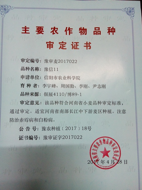 在今年上半年召開(kāi)的第八屆河南省主要農作物品種審定委員會(huì )第一次會(huì )議上,由我院小麥研究所李宇峰研究員主持選育的小麥新品種“豫信11”通過(guò)審定(審定編號:豫審麥2017022)。這是繼信陽(yáng)234、豐抗38、信麥9號之后,我院第4個(gè)通過(guò)審定的擁有完全自主知識產(chǎn)權的小麥品種。
