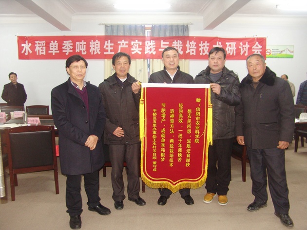 會(huì )議開(kāi)始前,來(lái)自平橋區五里辦事處王水村高產(chǎn)示范田所在地的村民關(guān)自順、平橋區成秀合作社理事長(cháng)董守成把一面寫(xiě)有“想農民所想,泥質(zhì)法育拋秧輕簡(jiǎn)高效,一改千年栽秧苦。造神奇方法,兩段栽培技術(shù)節肥增產(chǎn),成就單季噸糧夢(mèng)”的錦旗遞到段仁周院長(cháng)和“泥質(zhì)法”育拋秧、兩段栽培技術(shù)發(fā)明人宋世枝研究員手中,感謝我院給他們送來(lái)了增產(chǎn)增收、脫貧致富的好技術(shù)。今年9月,在關(guān)自順家的稻田里,經(jīng)收割機現場(chǎng)實(shí)收0.4畝水稻,收獲毛稻谷482.15公斤,當場(chǎng)按20%除去水分雜質(zhì),折算成標準稻谷385.72公斤,折合畝產(chǎn)稻谷964.30公斤。王水村及其周邊包括董守成在內的采用“泥質(zhì)法”育、拋秧和兩段栽培技術(shù)的村組近年來(lái)水稻平均畝產(chǎn)普遍達到700公斤的水平。