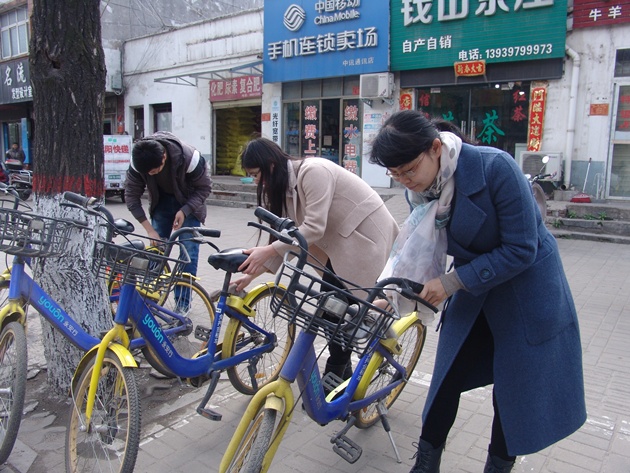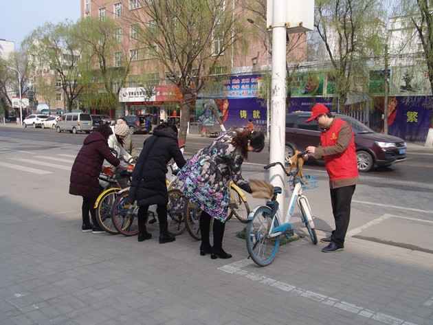 3月17日上午,我院50多名志愿者自動(dòng)分成4組,分別從寶石廣場(chǎng)和民橋南側出發(fā),對民權南街道路兩旁的共享單車(chē)進(jìn)行了清理整治。對停放不規范的共享單車(chē),將其重新停放到沿街停車(chē)線(xiàn)上,并把車(chē)頭一致向外擺放整齊,并對車(chē)身、車(chē)鎖、車(chē)座、車(chē)把進(jìn)行了清洗。同時(shí),志愿者們還積極向路過(guò)的群眾宣講文明出行的理念。志愿者們的行動(dòng)得到了沿街商戶(hù)和居民的一致好評,部分商戶(hù)熱情地向志愿者們提供自來(lái)水清洗抹布,一部分居民也積極地加入到活動(dòng)中來(lái)。