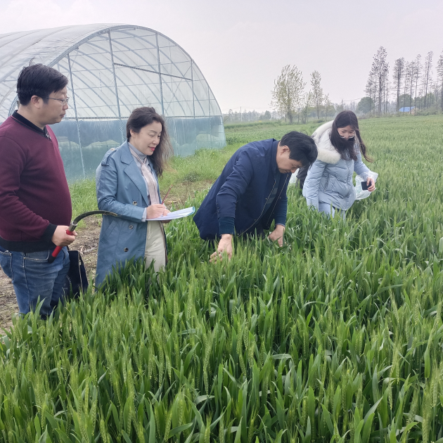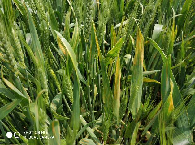2021年4月8-9日,我院科技人員對我市息縣孫廟鄉、項店鎮和淮濱縣臺頭鄉、固城鄉6個(gè)村20余塊麥田進(jìn)行病蟲(chóng)害調查,調查結果為:小麥白粉病、紋枯病、小麥蚜蟲(chóng)發(fā)生較輕,小麥條銹病中度發(fā)生。小麥條銹病病田率35%,病葉率1%~8%,總體發(fā)病程度1級,部分田塊有多個(gè)發(fā)病中心,發(fā)病中心病葉率高達60%,發(fā)病等級達到5級。