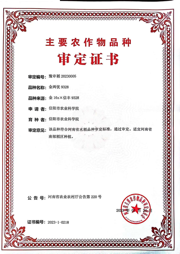 金兩優(yōu)9328(審定編號:豫審稻20230005)屬兩系雜交稻新品種。全生育期143天,株高116.5厘米,平均畝有效穗16.7萬(wàn)穗。2022年參加生產(chǎn)試驗,平均畝產(chǎn)稻谷694.8公斤。稻米品質(zhì)達部標優(yōu)質(zhì)三級標準,適宜在河南省南部稻區種植。